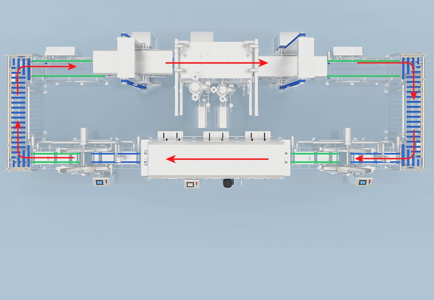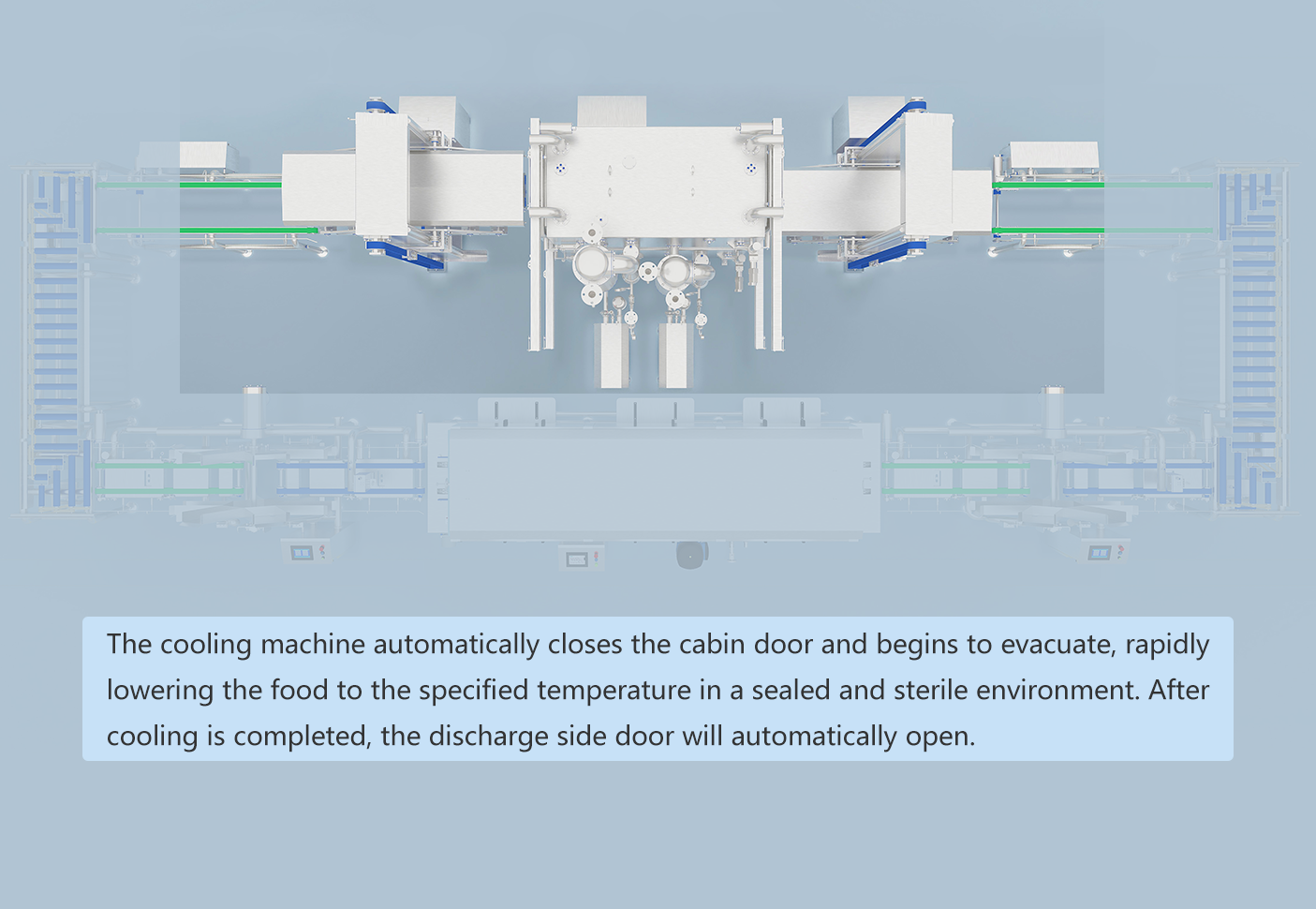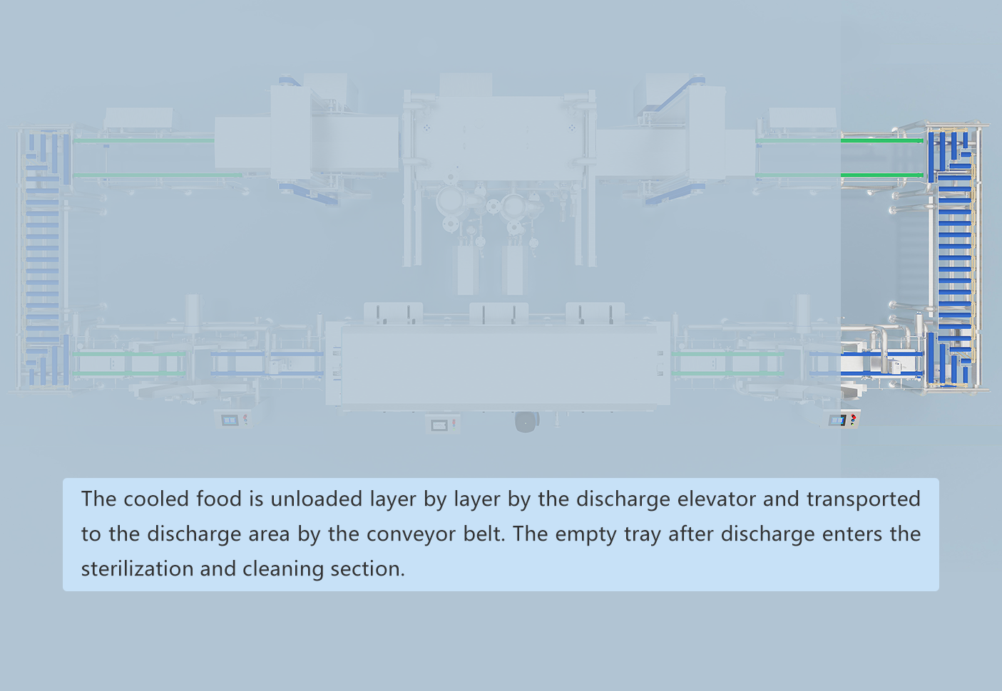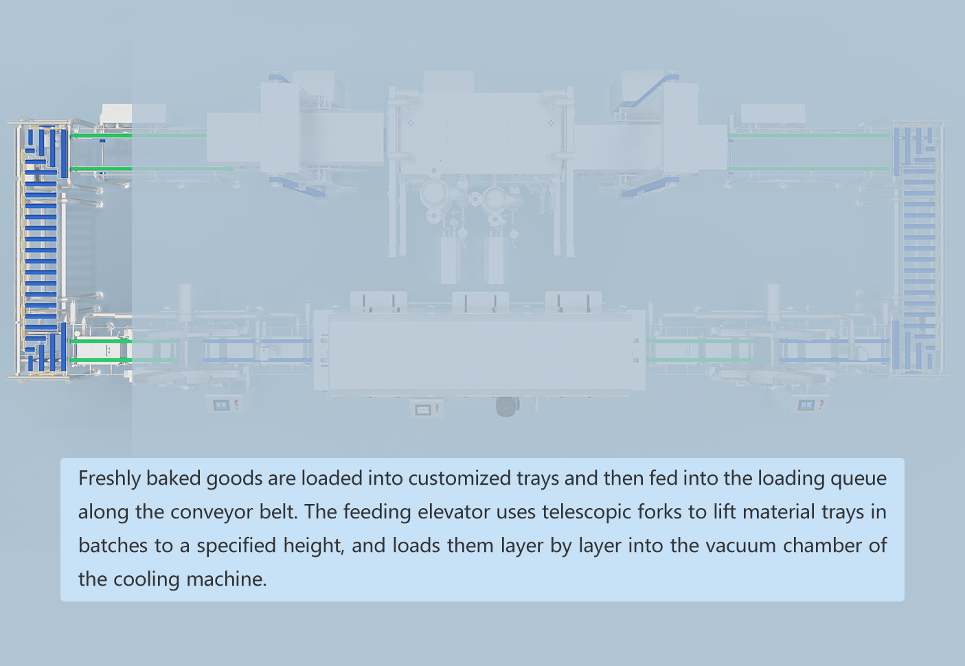 Für die schnelle Abkühlung von Backwaren. Integriert Sterilisations- und Reinigungsfunktionen für Behälter, ermöglicht kontinuierliches Abkühlen und Schalen-Rückführung in einem geschlossenen Kreisprozess.