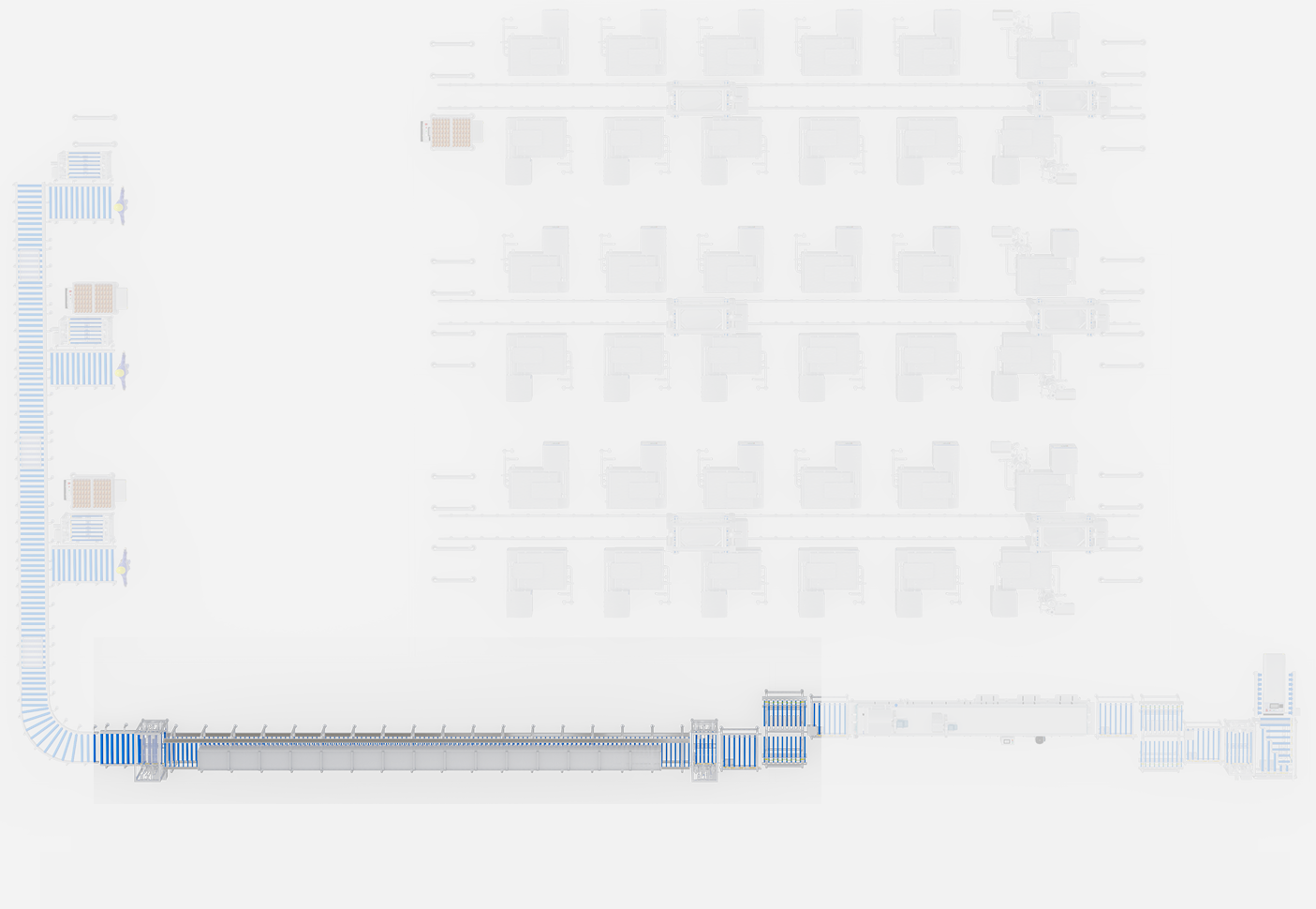 Für die Stapelproduktion von gewürztem Hühnerfleisch. Integriert Transport, Kochen, Kühlen und Reinigung von Containern in ein vollautomatisches System.