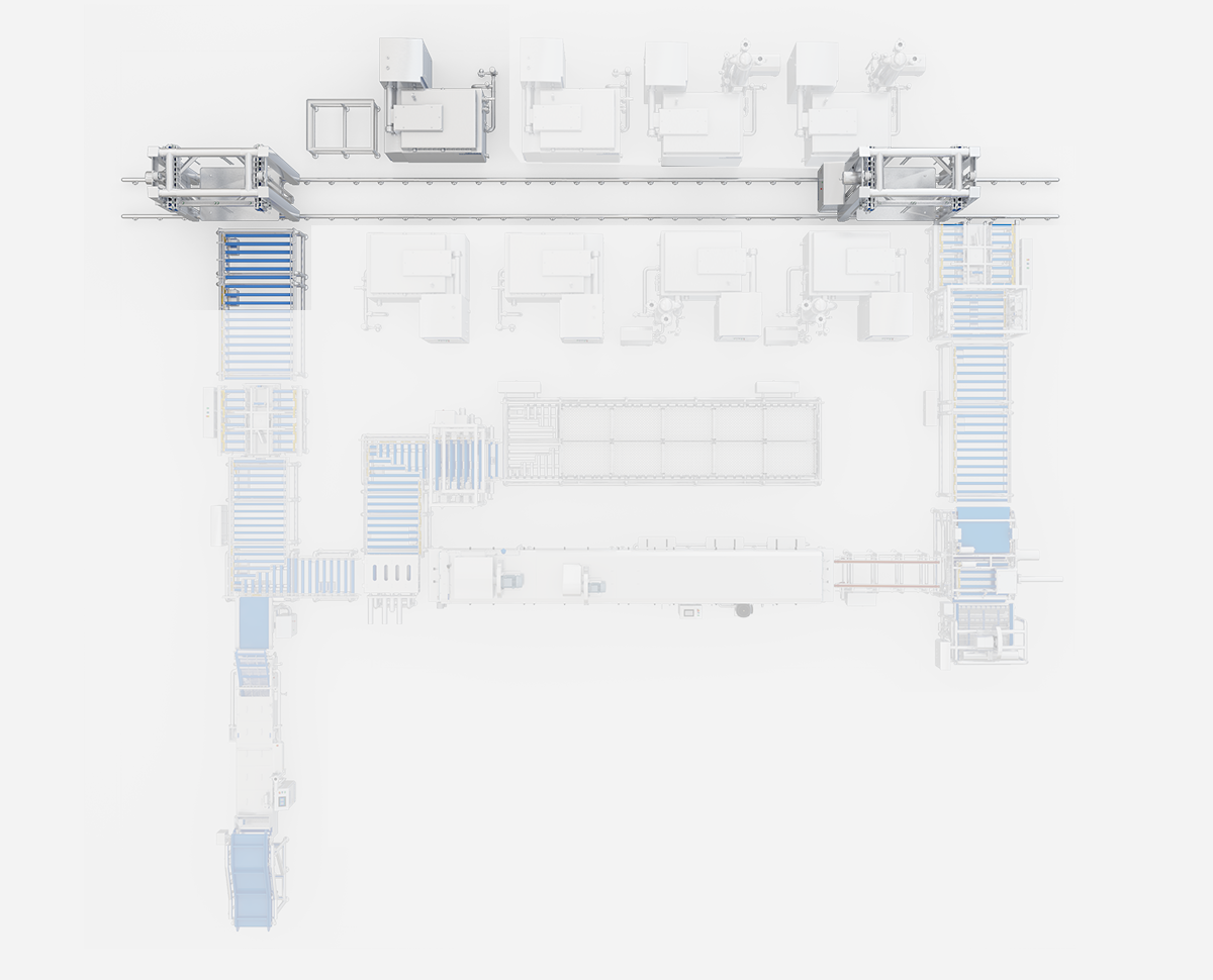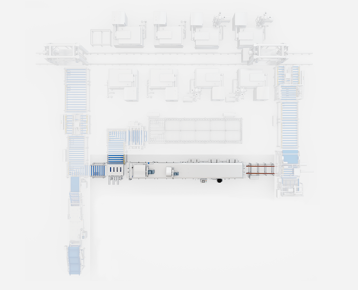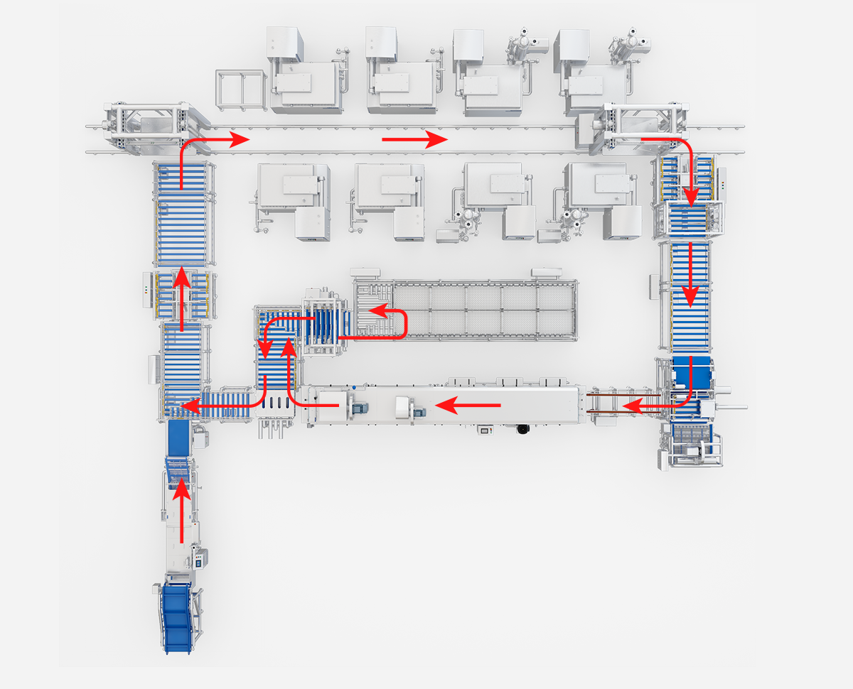 Wird für die Chargenfertigung von geräucherten Entenköpfen verwendet. Transport, thermische Bearbeitung, Abkühlung und Reinigung der Behälter werden durch ein einheitliches Programm koordiniert; die automatisierte Produktion entfällt auf manuelle Arbeit.